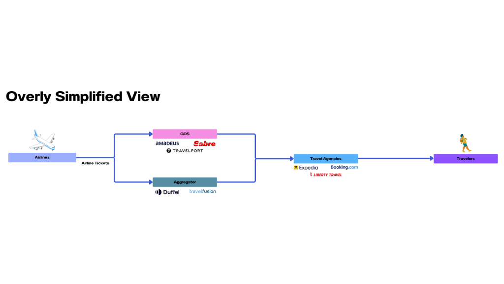 Let’s start with the distributors. Remember the online travel agencies and traditional travel agents we talked about earlier—the ones we see in front of the curtain? As it turns out, they don’t actually source airline tickets (inventory) themselves. Much like how a grocery store relies on a wholesaler to supply them with fresh fruit, these travel sellers depend on a middleman to access bookable inventory.